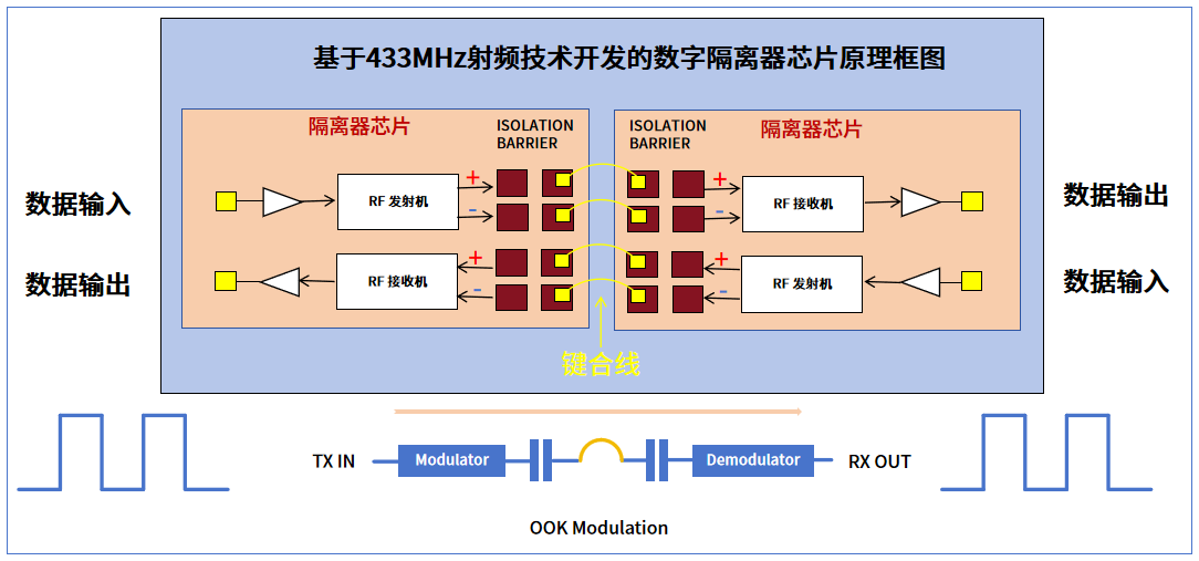 如上图所示,米兰微数字隔离器基于Sub-GHz射频技术开发,并采用了经典的OOK(On-Off Keying,开关键控) 射频调制方案,是一种产品内部具备微型无线射频收发系统的芯片。