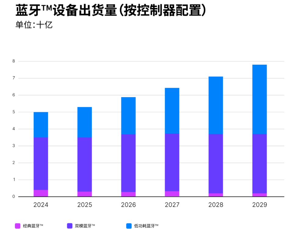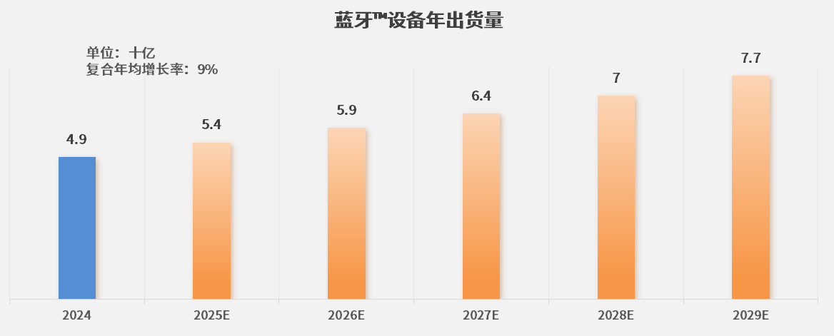 据蓝牙联盟最新公布的《2025年蓝牙市场最新资讯》显示,由于多个蓝牙细分市场呈稳步增长态势,2025年蓝牙设备年出货量将有望超过53亿台;同时,预计到2029年,蓝牙设备年出货量将达77亿台,复合年均增长率达9%。