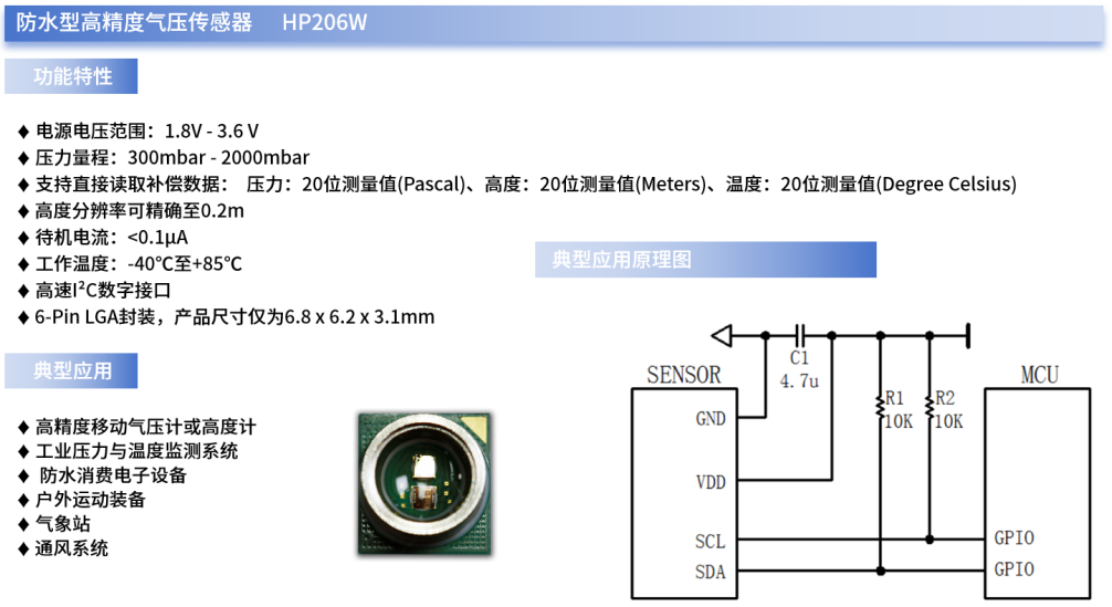 例如,米兰微自主研发的HP206W就是一款可同时精确提供气压、温度与高度数据的,带I²C接口的防水型高精度数字气压传感器。