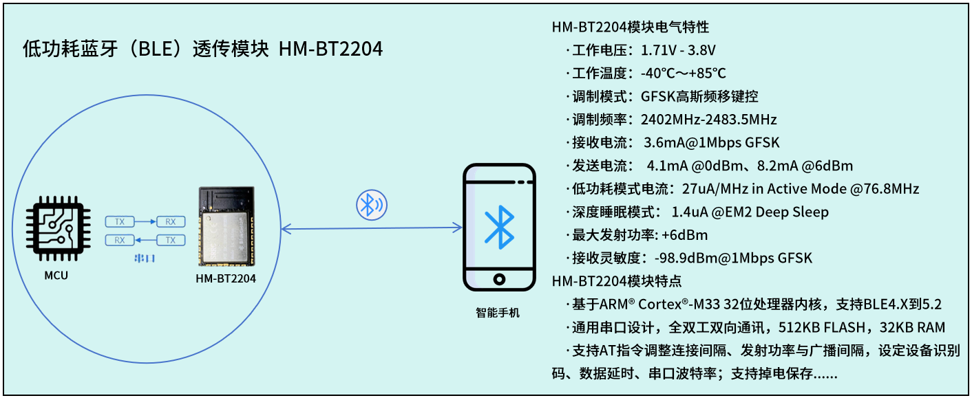 HM-BT2204基于一款高性能、低功耗蓝牙BLE 5.2 SoC芯片,采用32位ARM® Cortex®-M33处理器内核,最高主频76.8MHz,片上集成32KB RAM与512KB FLASH,内嵌2.4GHz射频收发器,搭载集成天线,支持无线数据透传功能,通过与外部MCU进行通信,可以快速实现BLE从设备与手机、平板等BLE主设备的无线连接和数据通信,外部MCU的资源占用低,可快速集成。