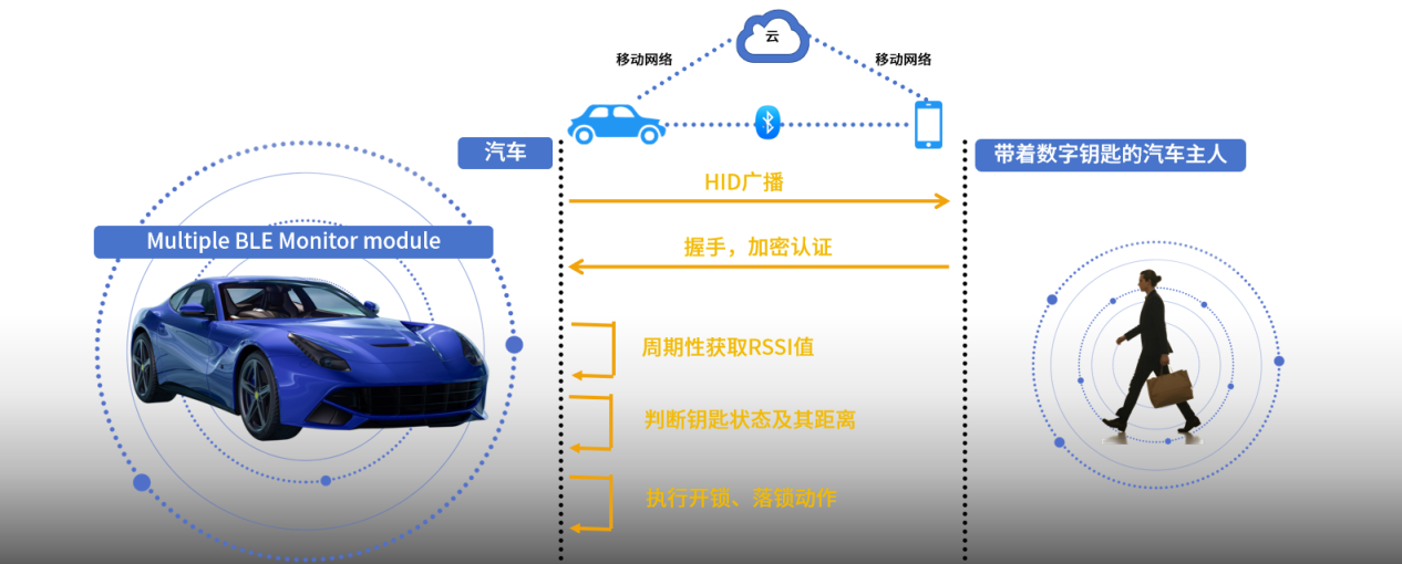 如上图所示,BLE数字车钥匙基于RSSI(接收信号强度指示)原理,该方案由BLE模块(嵌入锁具电路板中)、用户终端设备(智能手机/手表)及云端管理平台构成。