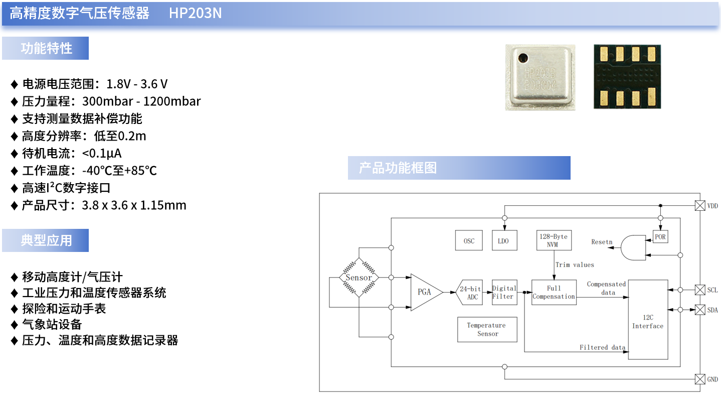 例如,HP203N就是一款带高速I²C接口的高精度数字气压传感器,可提供精确的温度、压力或高度数据,其压力和温度数据输出由高分辨率24位ADC进行数字化处理,高度数据输出则是通过特定算法根据压力和温度数据计算得出。此外,HP203N内部还集成了数据补偿功能(通过专用算法进行补偿),可减少外部主机MCU系统的工作量。