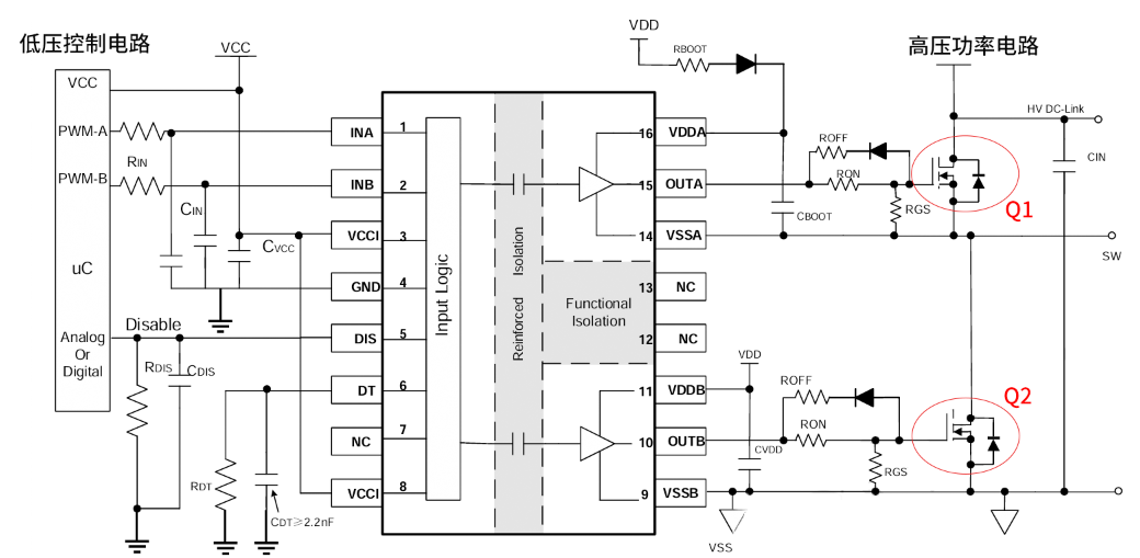 如上述应用原理图所示,在涉及高频电力变换的电路中应用隔离式栅极驱动器,不仅能有效抵御功率晶体管(Q1、Q2)快速开关时所带来的高压瞬变风险,保护低压侧逻辑电路的敏感元件,还能提供对操作人员的安全保障,防止高压侧故障时产生的触电隐患。